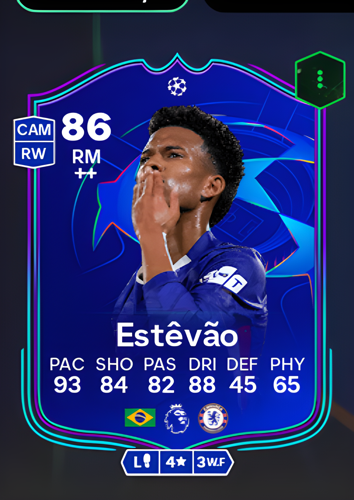 Introducing the dynamic UCL Primetime card of Estêvão Willian Almeida, an 86-rated Right Midfielder whose attributes promise electrifying performances on the virtual pitch. With a blistering 93 pace, exceptional 88 dribbling, and a sharp 84 shooting, he embodies the qualities of a devastating wide attacker. As a winger, his explosive speed and technical mastery make him a sharp offensive weapon, perfectly suited to quickly tear apart the opposing team's defense, carve out decisive opportunities, and seal the deal with crucial goals.