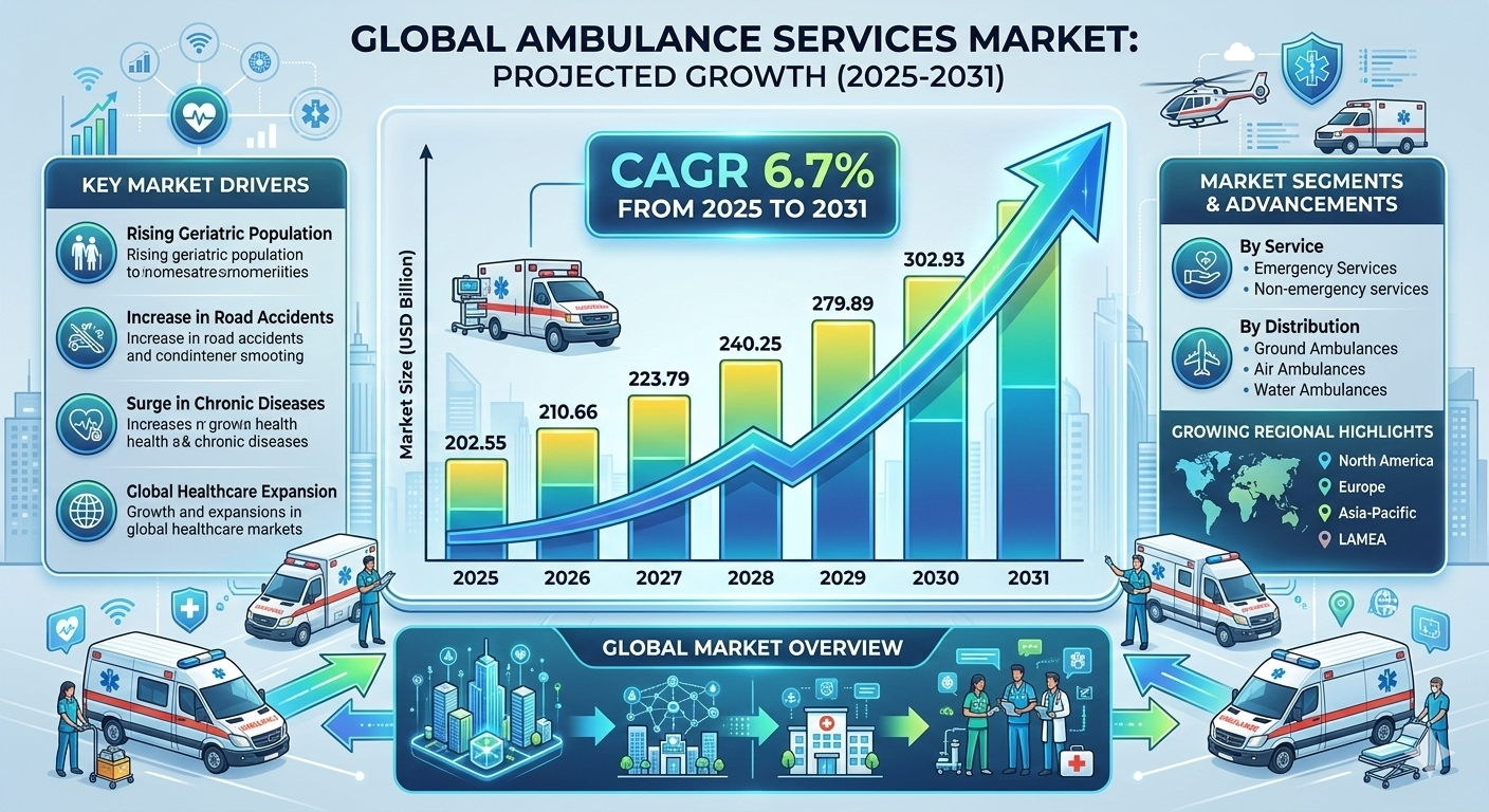 The Ambulance Services Market is experiencing steady growth as demand for rapid emergency response and efficient patient transportation increases worldwide. The Ambulance Services Market is expected to register a CAGR of 6.7% from 2025 to 2031, Rising healthcare emergencies, road accidents, and the need for timely medical intervention are encouraging healthcare systems to strengthen emergency medical service infrastructure.