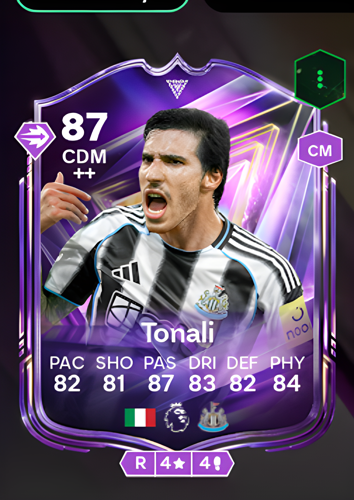 Sandro Tonali's FC Pro card is an elite Central Defensive Midfielder boasting an impressive overall rating of 87, backed by a well-rounded stat profile that includes 82 pace, 81 shooting, 87 passing, 83 dribbling, 82 defense, and 84 physicality. As a deep-lying midfielder, this card excels in dictating the tempo of the game with its exceptional passing ability, allowing you to orchestrate play from the base of midfield. Furthermore, its strong defensive awareness and physical presence make it a formidable shield for the backline, adept at breaking up opposition attacks and recycling possession to launch decisive counter-attacks.