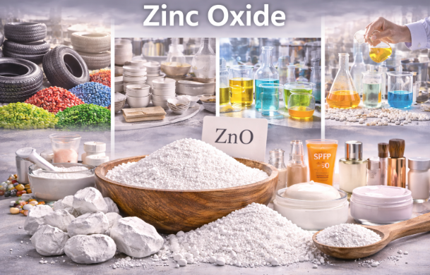 Zinc oxide, denoted as “ZnO,” is an inorganic compound made up of zinc and oxygen. It usually appears as a white, odorless powder that is insoluble in water. It is commonly utilized as a functional additive because of its primary features, which include UV absorption, antibacterial action, chemical stability, and catalytic behavior. Because of these properties, zinc oxide is widely used in sectors like rubber, medicines, cosmetics, ceramics, paints, chemicals, and agriculture.