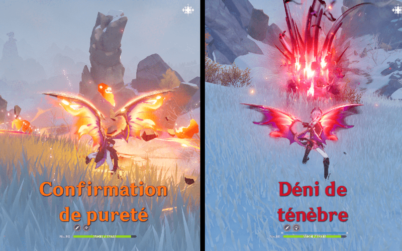 Ce changement de mode s’opère grâce à sa compétence élémentaire, intitulée « forme binaire : convergence et division ». Après une première activation, le joueur a le choix d’enchaîner avec une autre compétence pour activer l’état confirmation de pureté, qui confère un rôle de soutien, augmentant la synergie avec les alliés. Alternativement, il peut effectuer une attaque normale pour passer dans l’état déni de ténèbre, un mode axé sur la puissance offensive, idéal pour infliger des dégâts importants en combat direct.