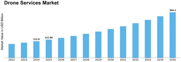 As per Market Research Future analysis, the Drone Services Market Size was estimated at 111.0 USD Billion in 2024. The Drone Services industry is projected to grow from 121.6 USD Billion in 2025 to 304.2 USD Billion by 2035, exhibiting a compound annual growth rate (CAGR) of 9.6% during the forecast period 2025 - 2035.