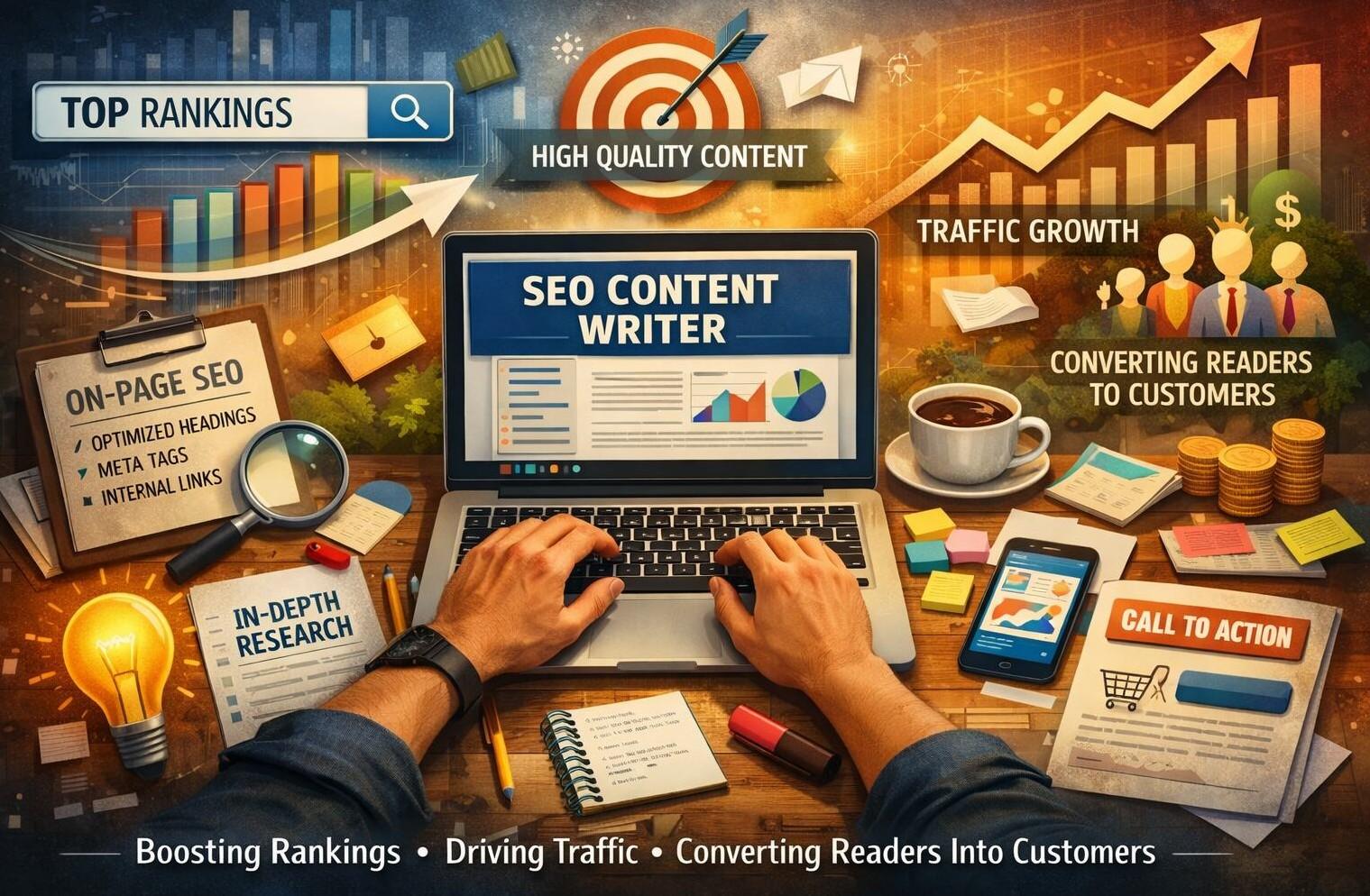 SEO Content Writer crafting keyword-rich, engaging, and research-driven content that boosts rankings, drives traffic, and converts readers into customers.